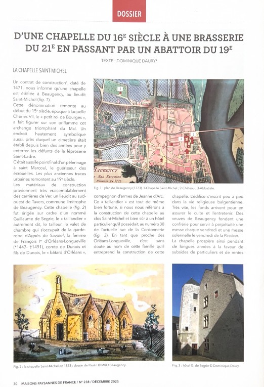 Notre partenaire "Maison paysannes de France" a consacré dans son numéro trimestriel de décembre 2025 un article rédigé par Dominique Daury "D'une chapelle du 16ème siècle à une brasserie du 21ème en passant par un abattoir du 19ème". Vous y trouverez quelques comléments concernant la brasserie "les félins" à l'article très détaillé paru dans notre bulletin annuel n°47. Pour vous le procurer cliquez sur l'image.